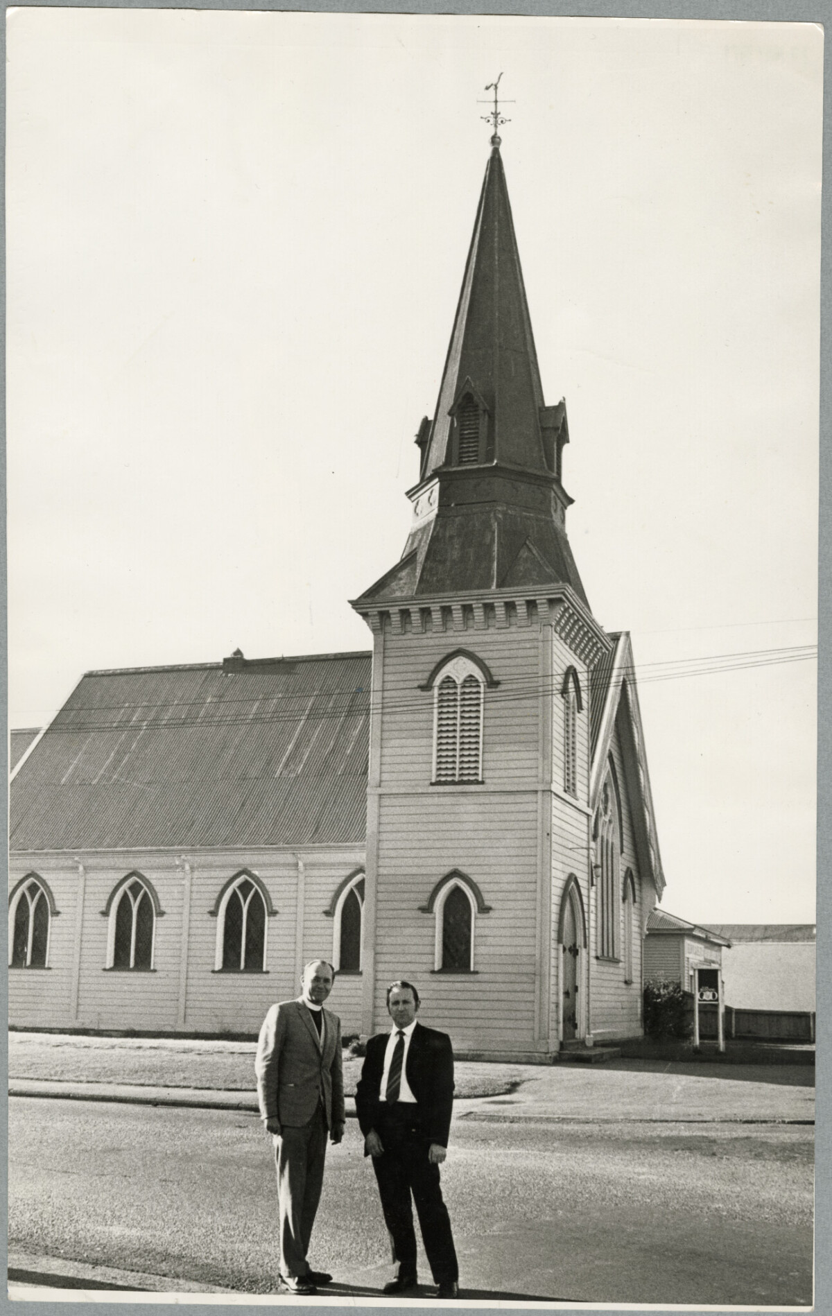 Rev N. Van der Kley and F.L. Cleveland outside St Peter's Presbyterian church on the corner of Ferry Road and Aldwins Road.