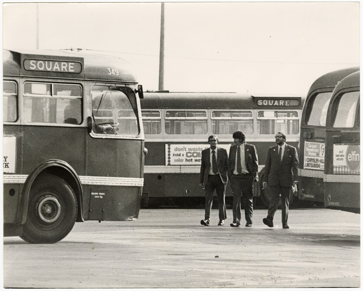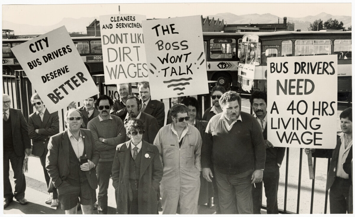 Bus drivers with placards protesting low wages outside the Christchurch Transport Board bus depot on Ferry Road.