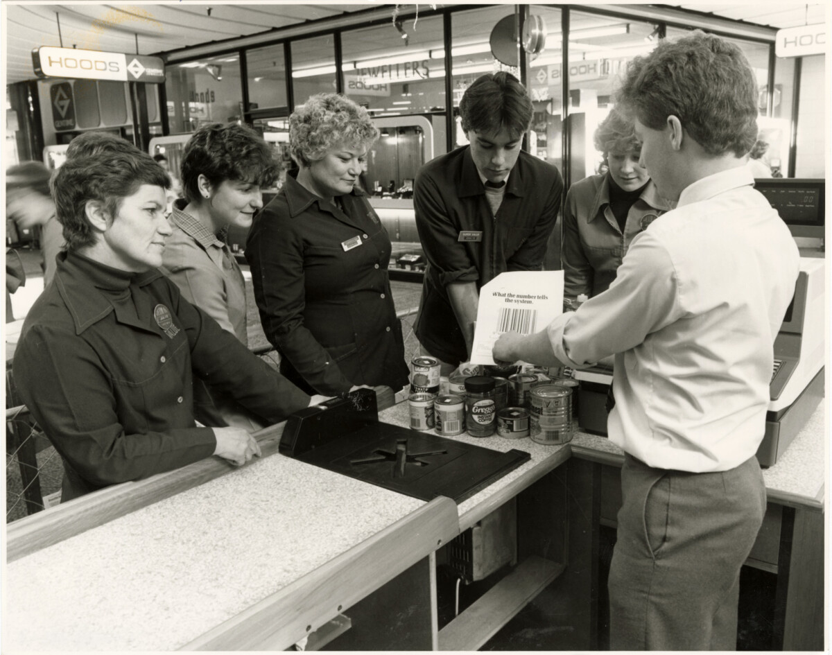 Checkout staff at the Supervalue Supermarket at Northlands Shopping Mall learning the new bar coding system being implemented.
