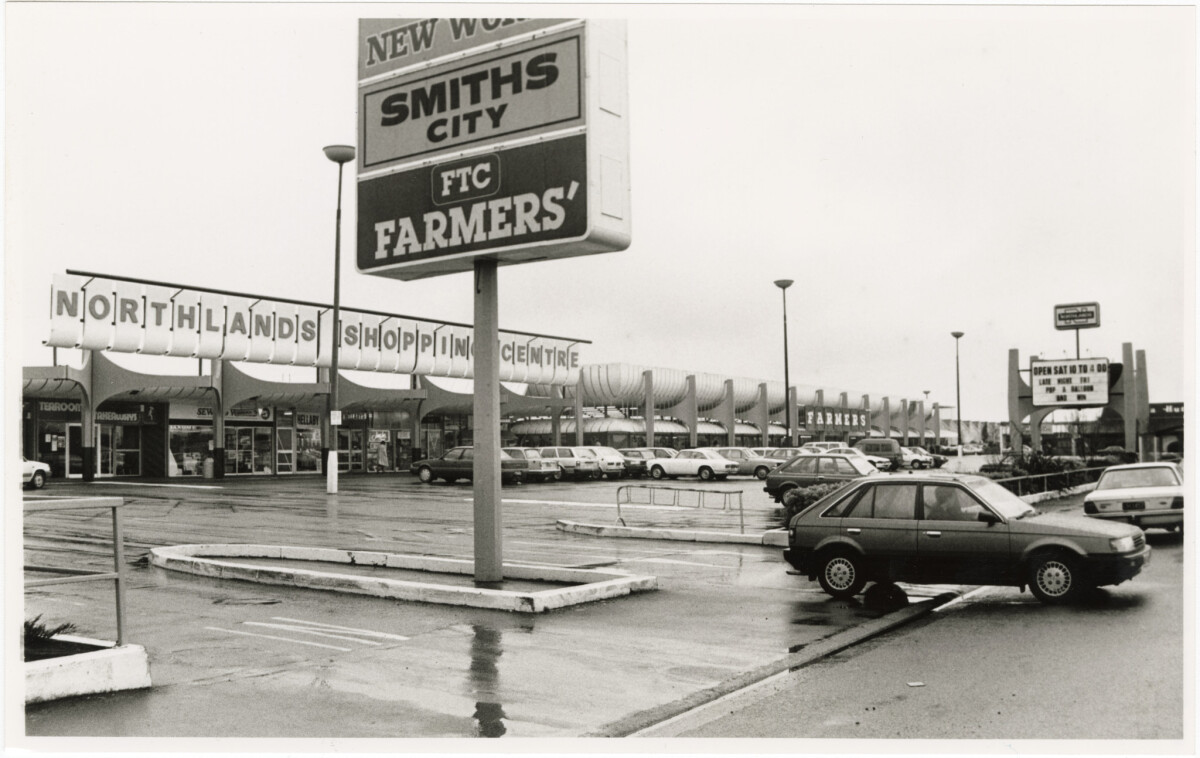 View of the car park area, signage and entrance to Northlands Shopping Mall, Papanui. Signs for Smiths City, Farmers and New World stores are in the foreground.