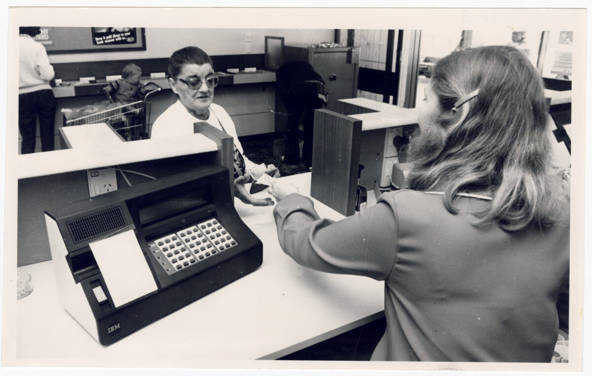 Interior of a customer being served by a teller at the Speedibank branch of Canterbury Savings Bank at Northlands on Main North Road.