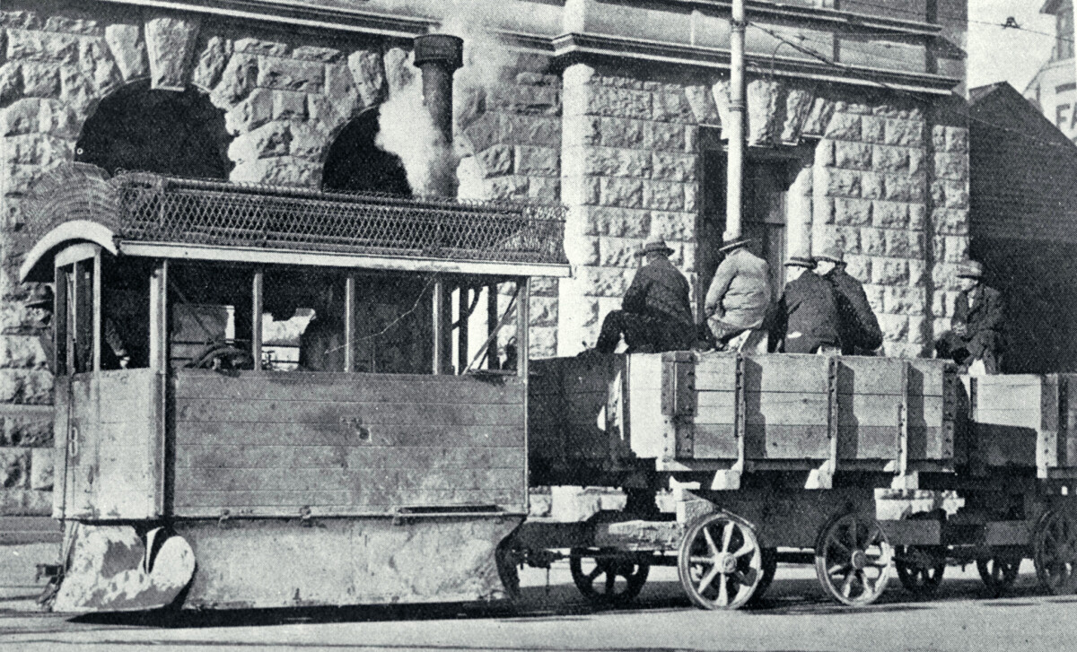 A Kitson steam tram runs past the Government Buildings