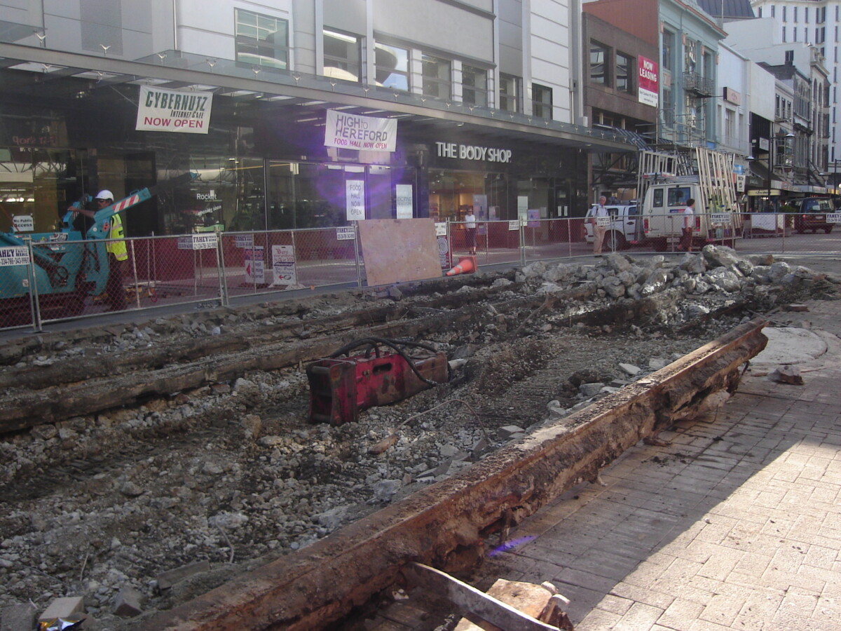 Tramway extension in Cathedral Square. Note the ANZ/BNZ/TSB bank buildings. Either demolished or still standing? In any case, you can see as to how well this project was going. Indeed, the rails were to join up with those already in Cathedral Square, at the "junction" (if you will) behind the Cathedral. The rails with be the next item to go down.