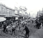 Laying the lines in High Street. A work party digging up High Street with pickaxes to lay tramlines. Pedestrians, some wth bicycles, are watching.