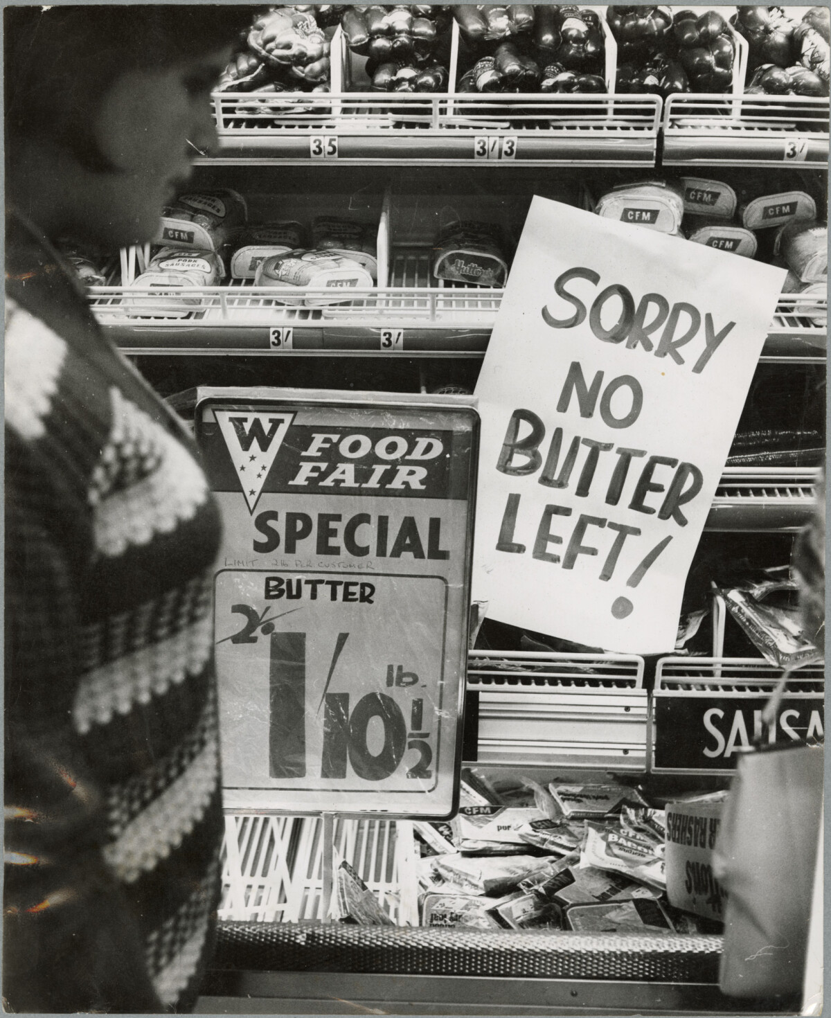 Close-up of a sold out of butter sign in the chilled section of a New Brighton supermarket the day after the price of butter rose to 2/10.