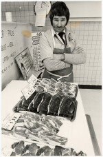 Harold Fletcher of Percy's Meat Market with his limited supply due to the drivers strikes.