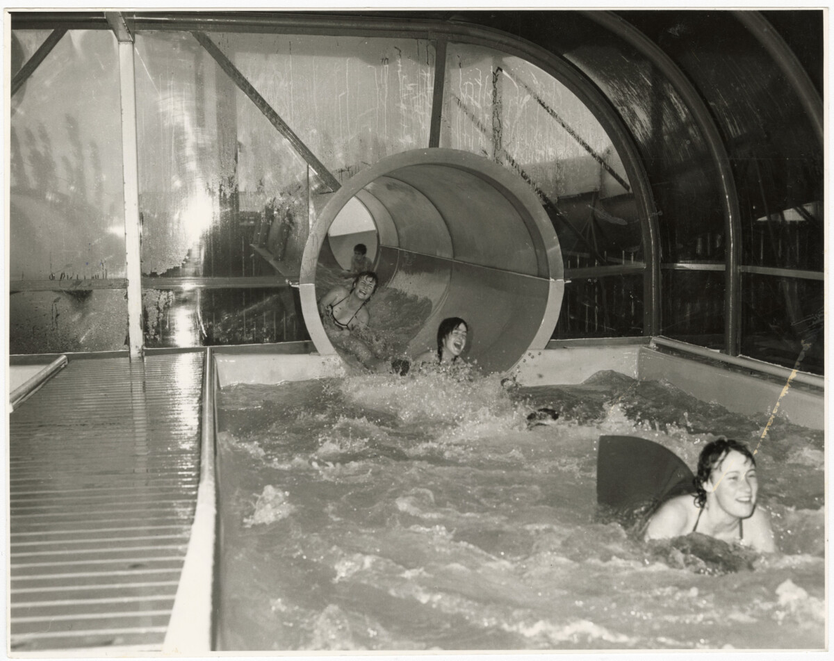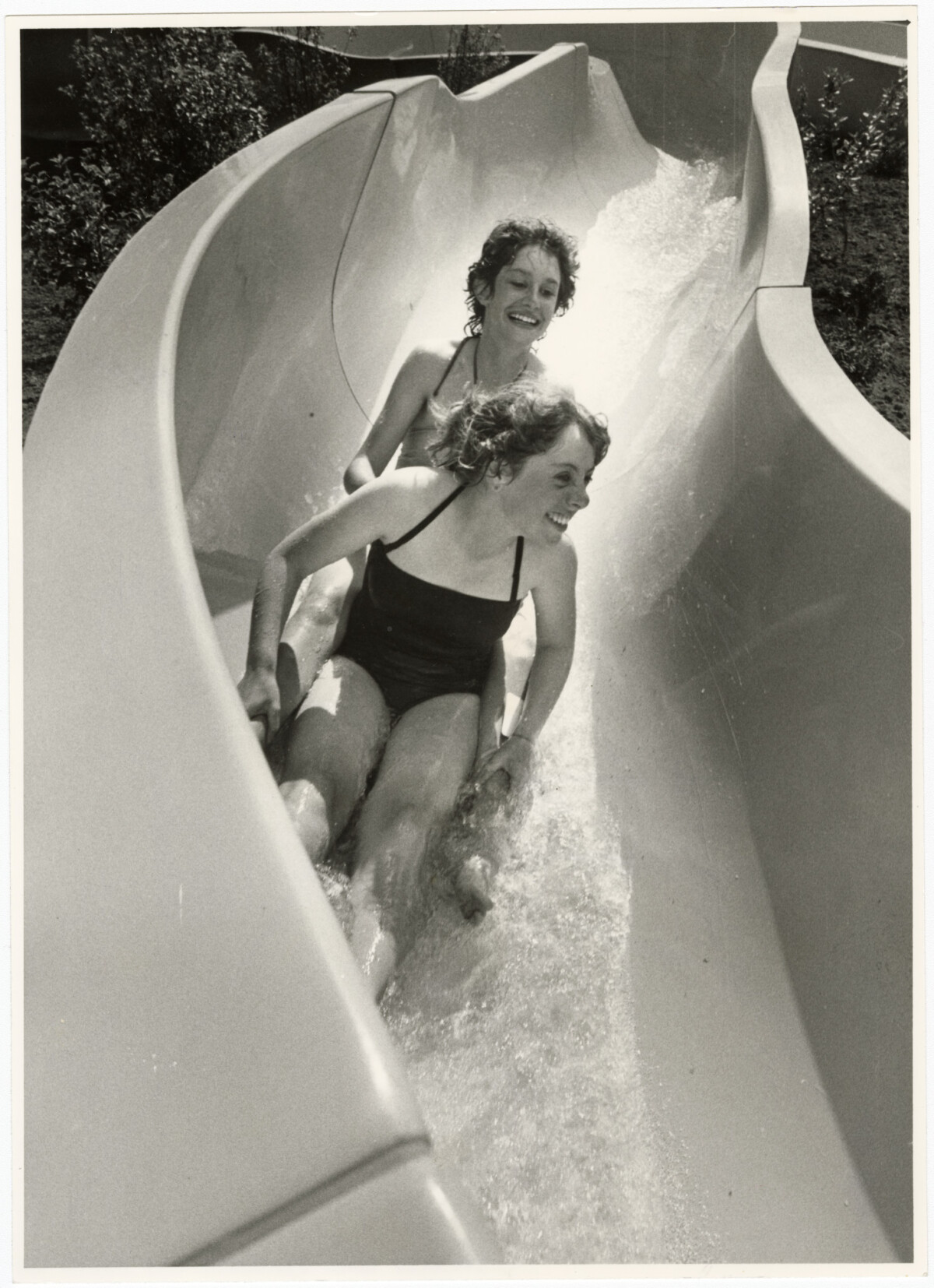 Laura Reynolds and Lisa Feutz on a water slide at Jellie Park Aqualand.