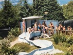 Adults and children emerging out the end of the Hydroslide at QEII Park.
