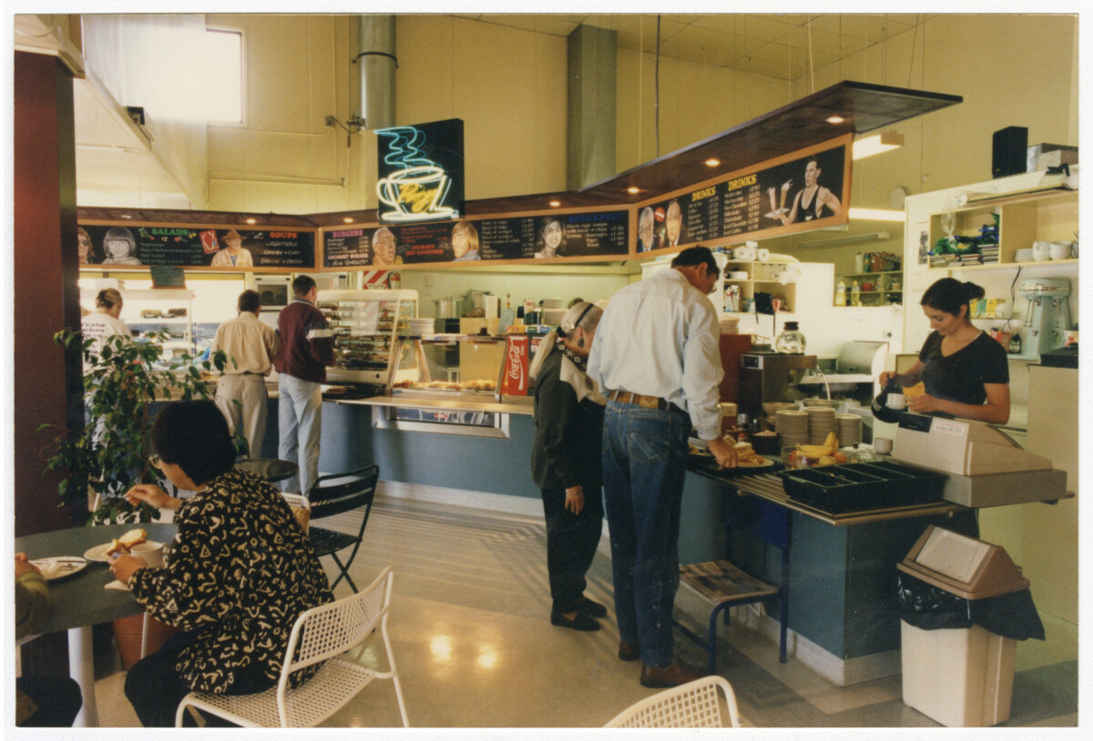 Interior of Perrys Café, 145 Madras Street, servery with customers purchasing and eating.