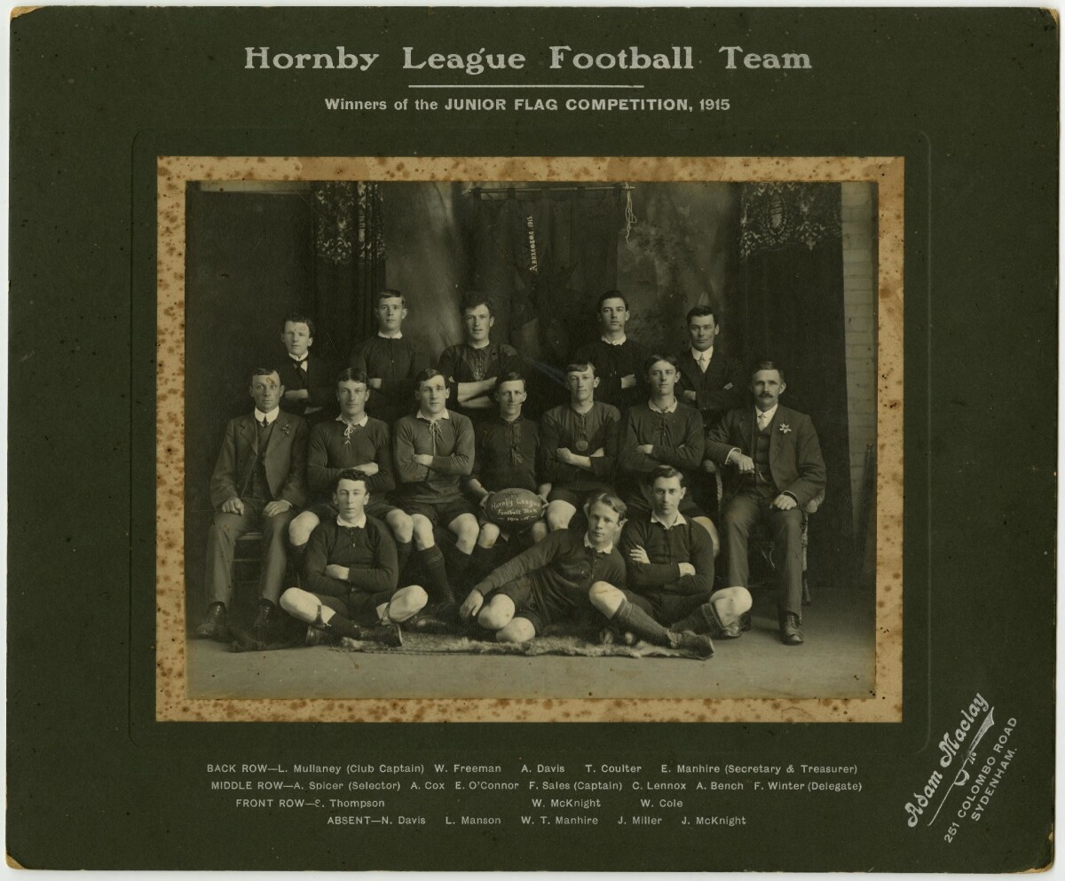 Inscription on frame reads: "Hornby League Football Team. Winners of the Junior Flag Competition, 1915. Back row- L. Mullaney (club captain), W. Freeman, A. Davis, T. Coulter, E. Manhire (secretary & treasurer). Middle row- A. Spicer (selector), A. Cox, E. O'Connor, F. Sales (captain), C. Lennox, A. Bench, F. Winter (delegate). Front row- E. Thompson, W. McKnight, W. Cole. Absent- N. Davis, L. Manson, W. T. Manhire, J. Miller, J. McKnight."