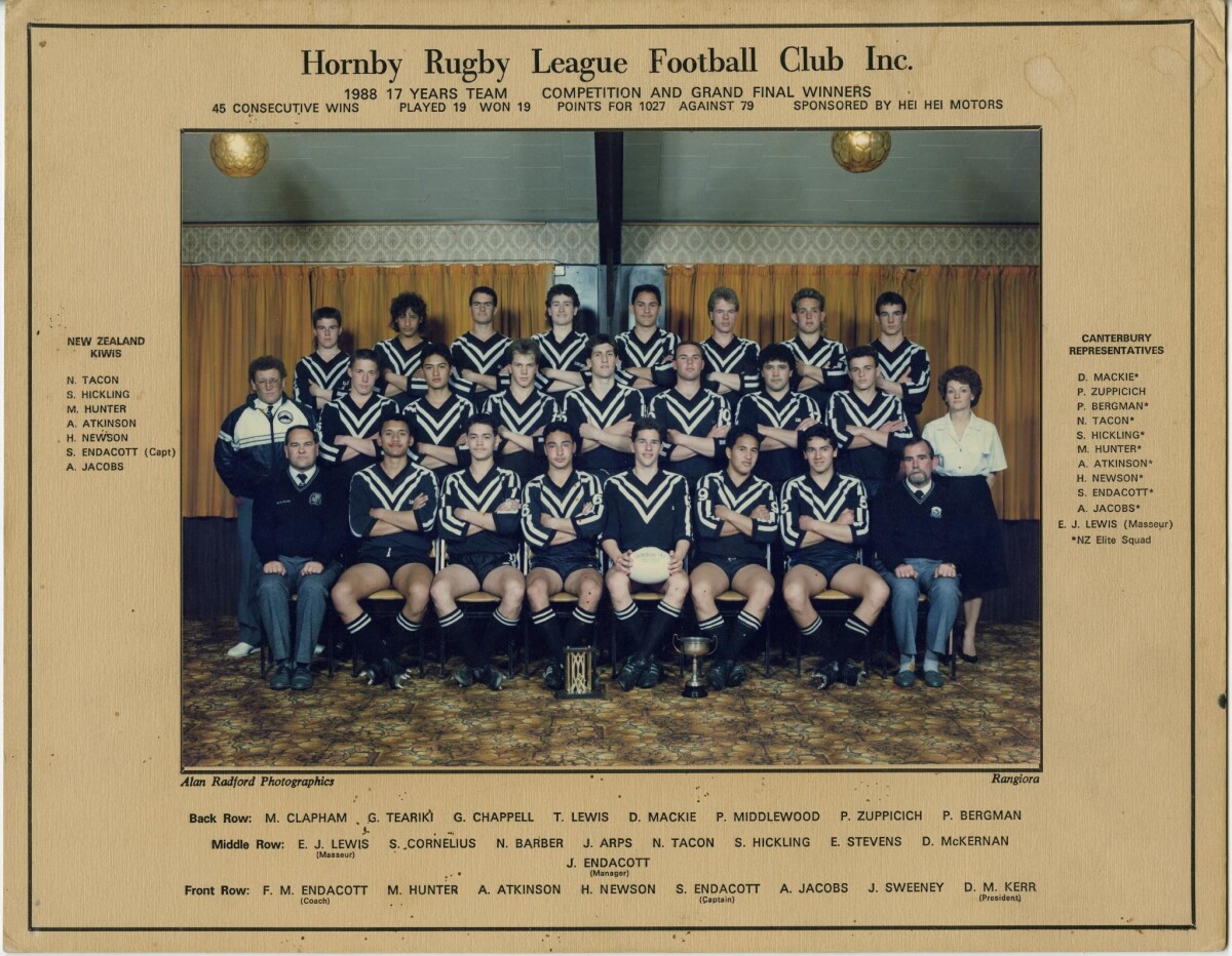 Hornby Rugby League Football Club, 1988. 17 years Team Competition and Grand Final winners. Coached by Frank Endicott who went on to coach the Warriors, Wigam and the Kiwis. This team produced 7 players who made the 17 year NZ representative side which is a record of any club team.