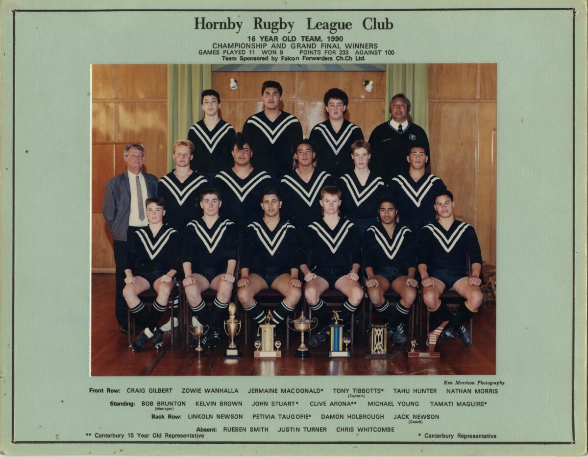 Hornby Rugby League Club, 16 year old team. Championship Grand Final winners. This team was coached by Jack Newson and managed by Bob Brunton. Bob went on to be Chairman of the Canterbury League for many years.