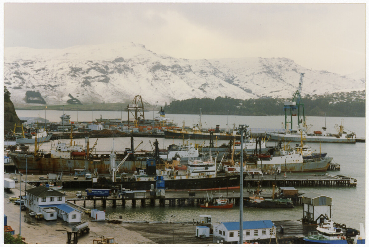 View across Lyttelton Harbour towards Diamond Harbour, Purau and Banks Peninsula covered in snow.