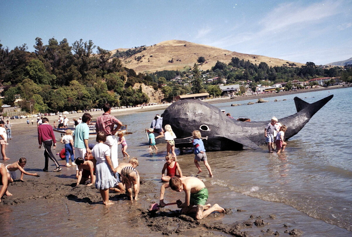 Families playing at the beach at Akaroa by a model of a whale. The whale was created as part of the sesquicentennial (150th anniversary) of New Zealand in 1990 with the logo including the kōtuku or white heron visible near the tail behind two children.