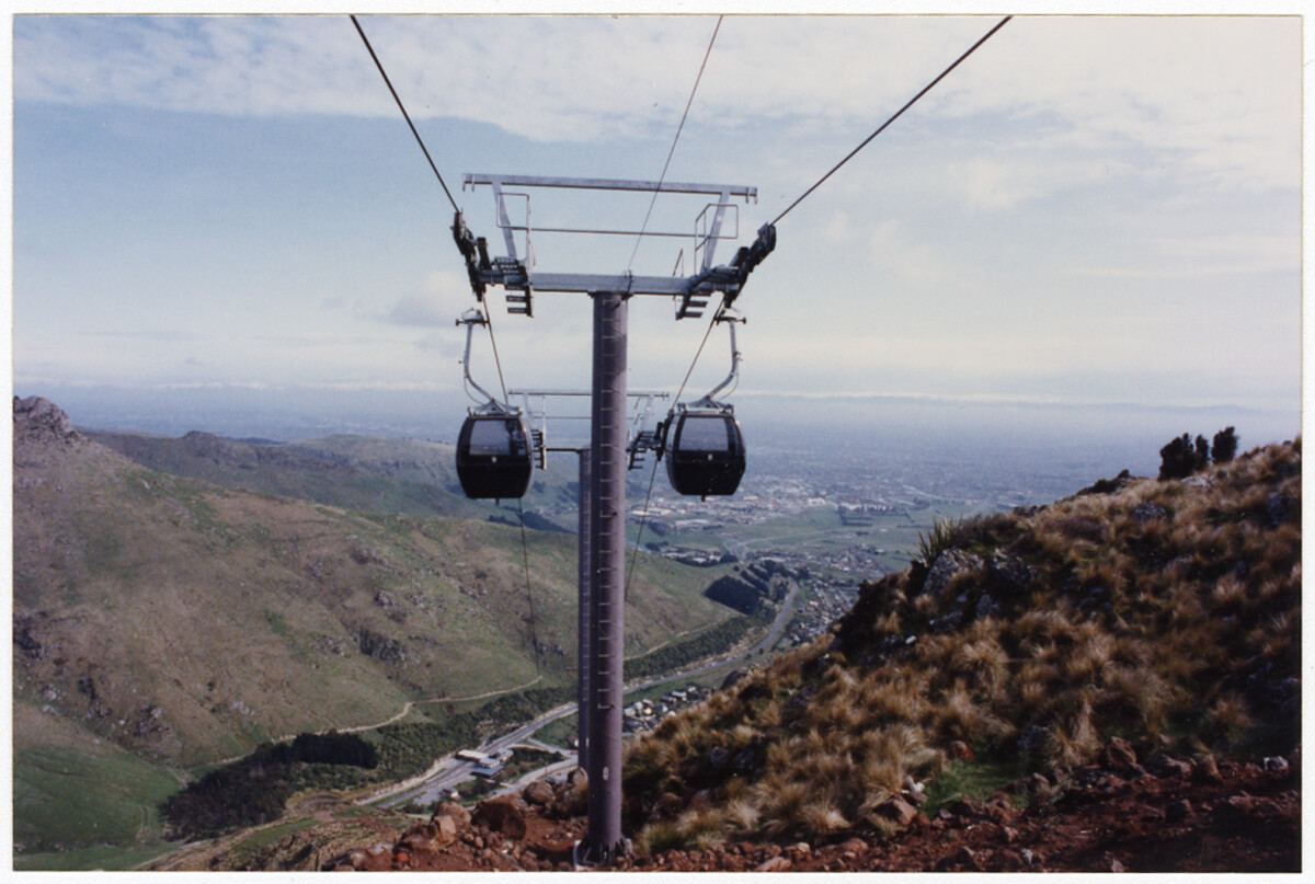 Christchurch Gondola passenger cabins with view of Christchurch city, the Canterbury Plains, and the Southern Alps.