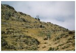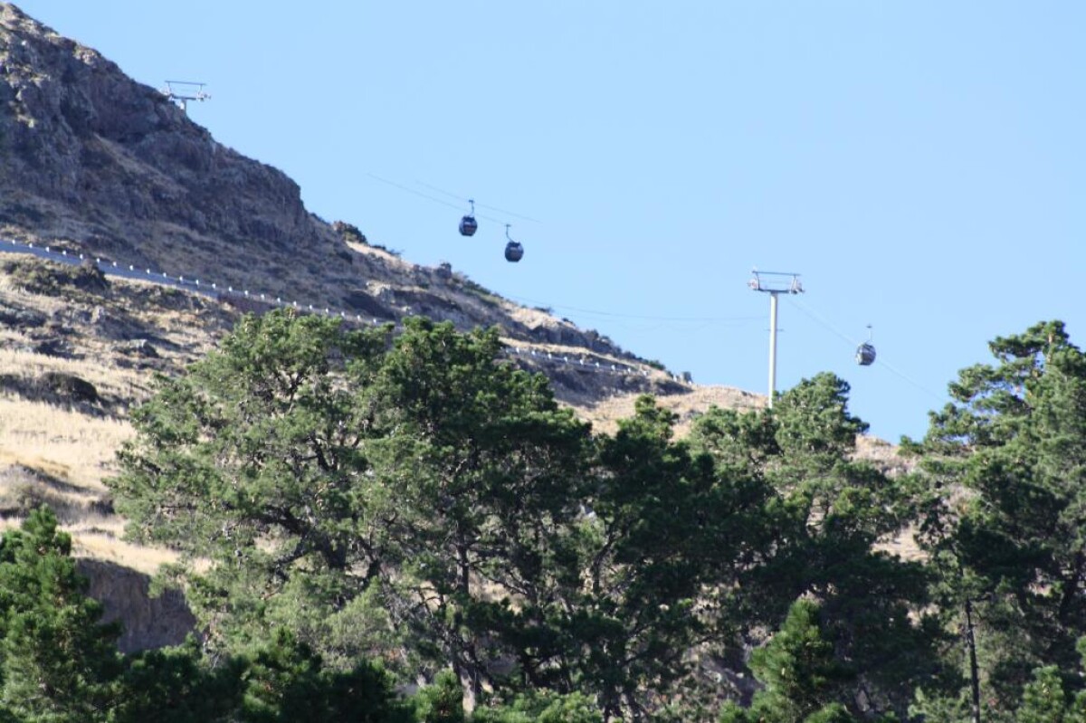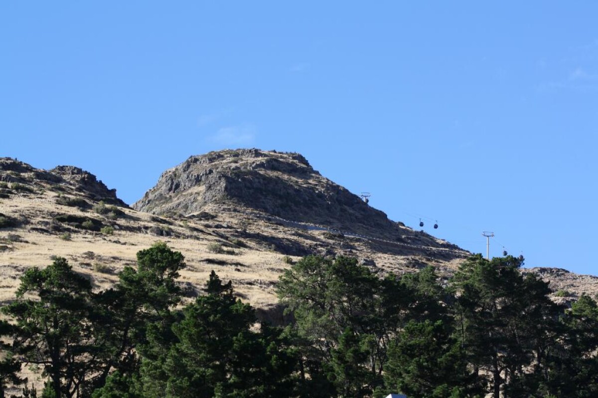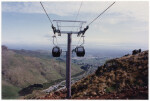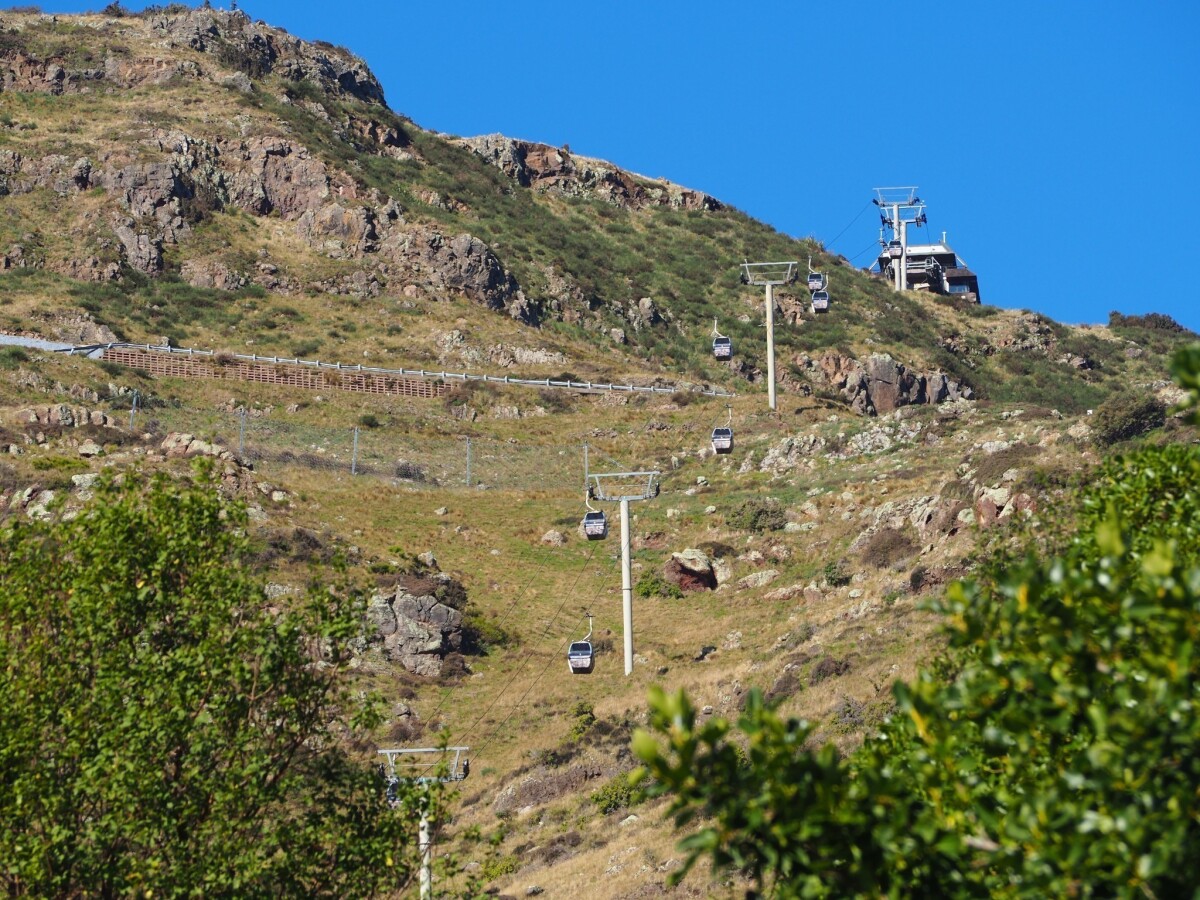 View of the Christchurch Gondola travelling up the Port Hills towards the Red Rock Cafe at the top gondola station. Taken from the car park just off Bridle Path Road.