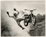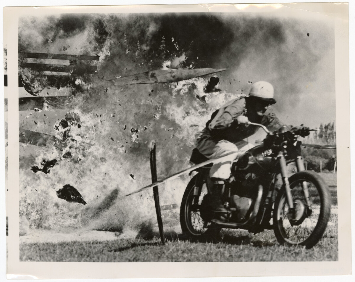 A motorcyclist and member of the Helldrivers, Dennis Rees, performing a stunt being blasted by gelignite on Waimairi Beach to advertise a larger show at Addington grounds.