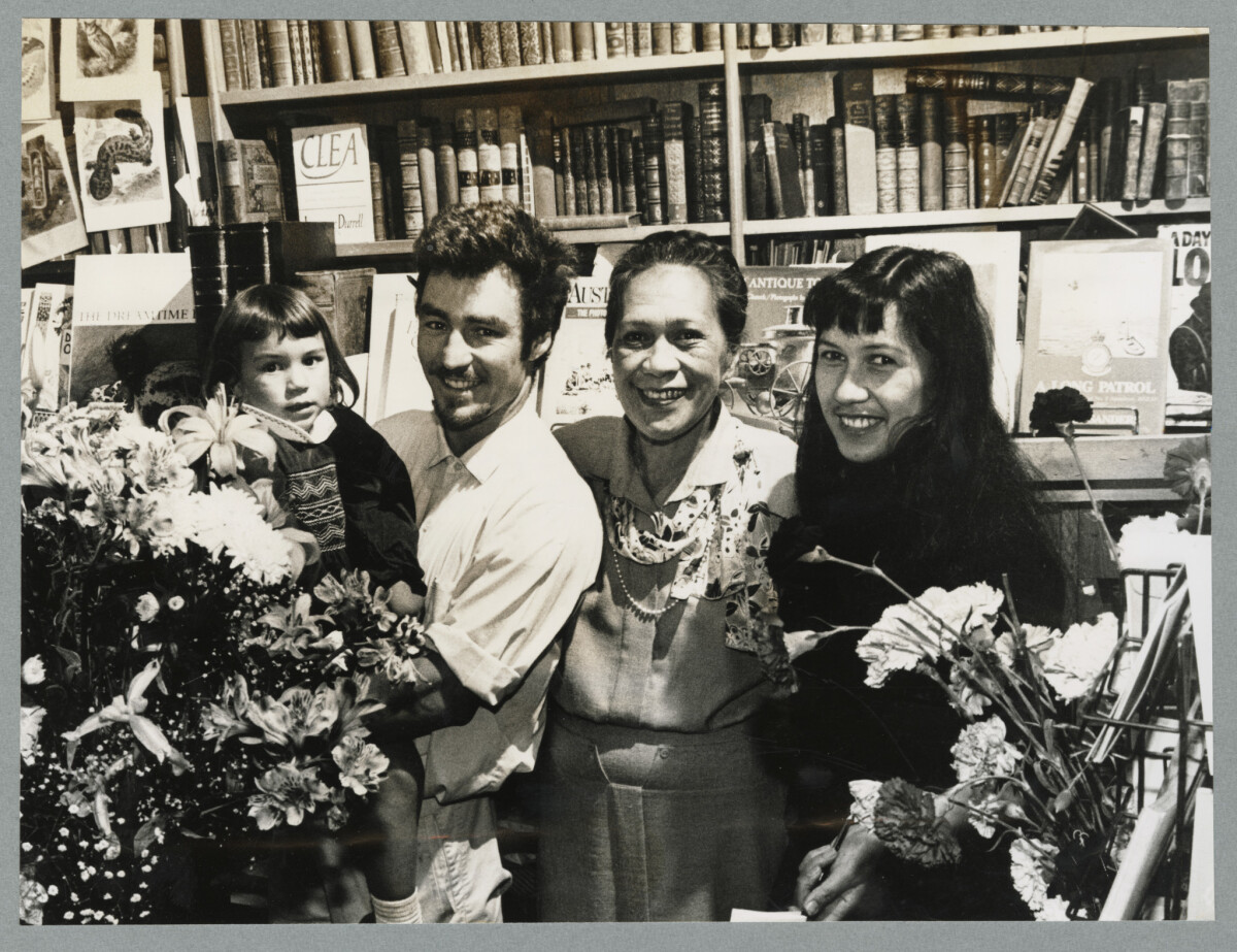 Family owners of Smith's Second-hand Bookshop at 133 Manchester Street. Mrs Rangi Oberg (centre) with son-in-law Ross Humphries, daughter Stephanie and grand-daughter Holly. Taken inside the bookshop with stock shelved in the background.
