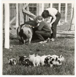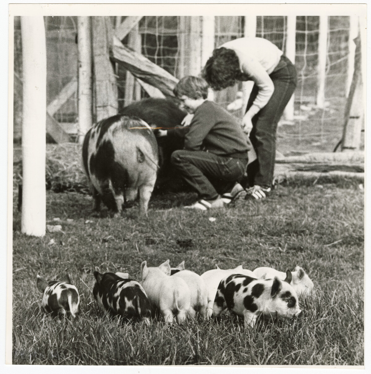 Two people with Kuni Kuni pigs, and piglets, a breed which originates from China, at the Kenyon household on Hills Road.