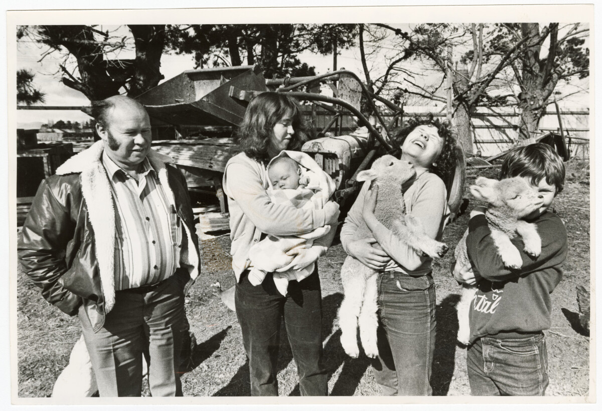 Kenyon family members at their home on Hills Road with two of the children holding lambs. Pictured are, from left, Frank Kenyon, Debbie Kenyon, Michael Kenyon (baby), Joanne Kenyon and Keith Kenyon.