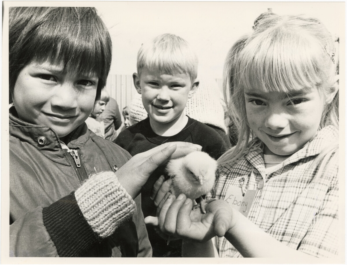 Children from Beckenham School, Hohaia Puru (left) and Ebony Nation, holding a new-born chick at the City Farmyard event at Addington Show Grounds.