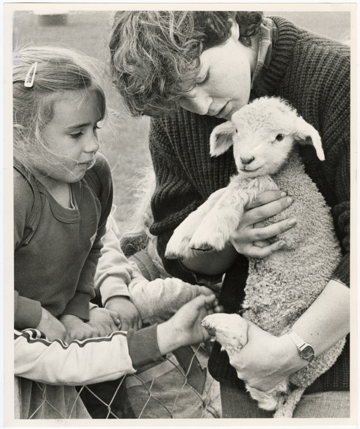 Vicki Blatchford of Christchurch Girls' High Young Farmers Club, holding a lamb for Brydie Wood, aged 5, at the City Farmyard event at Addington Show Grounds.