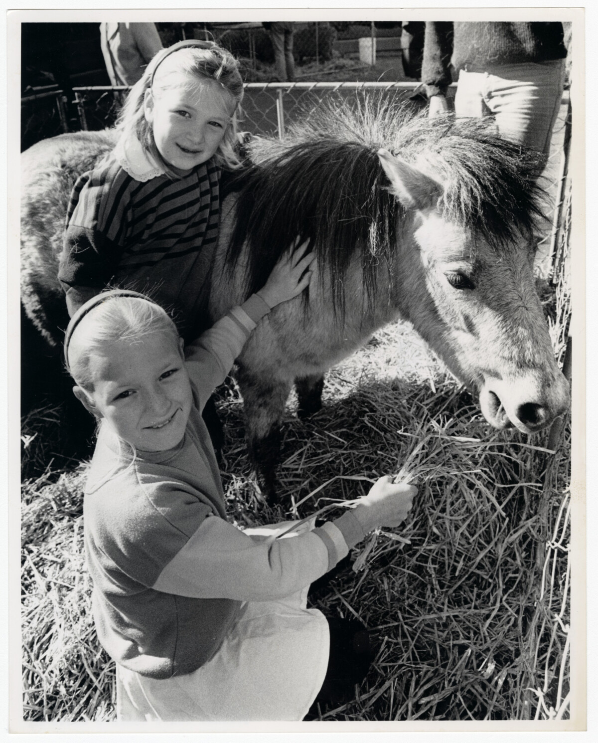 Gidget the pony from Willowbank being fed by Margot and Alice Pickering at the Trust Bank Canterbury's animal display in Cashel Mall.