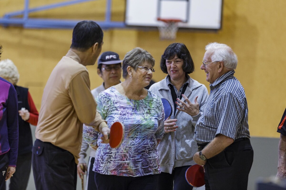 Members of the Bishopdale Table Tennis Club chat in the break between games at the Bishopdale Recreation Centre, YMCA, Bishopdale.