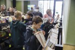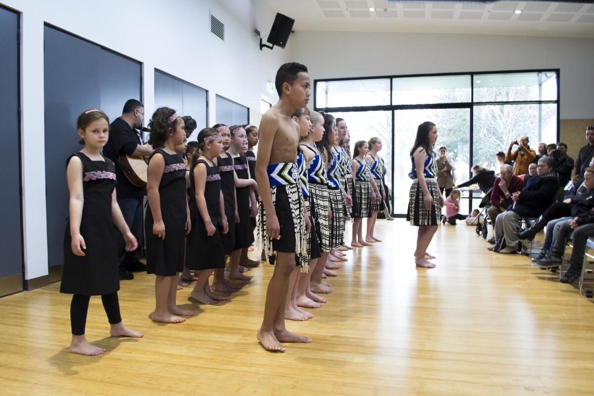Local intermediate school perform a haka at the new Bishopdale Library opening in one of the community rooms. The school children are watched by a crowd of visitors.