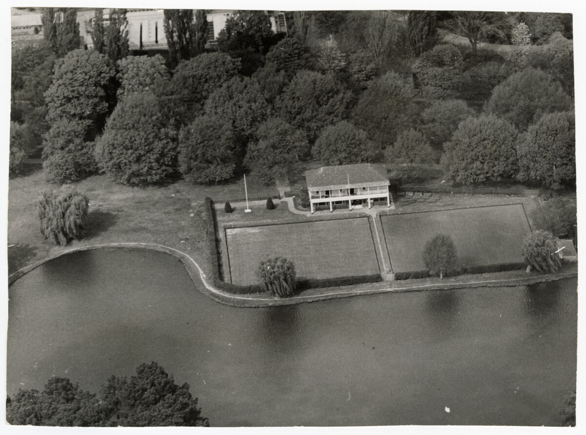 Aerial view of the Christchurch R.S.A bowling green at Hagley Park and Victoria Lake.