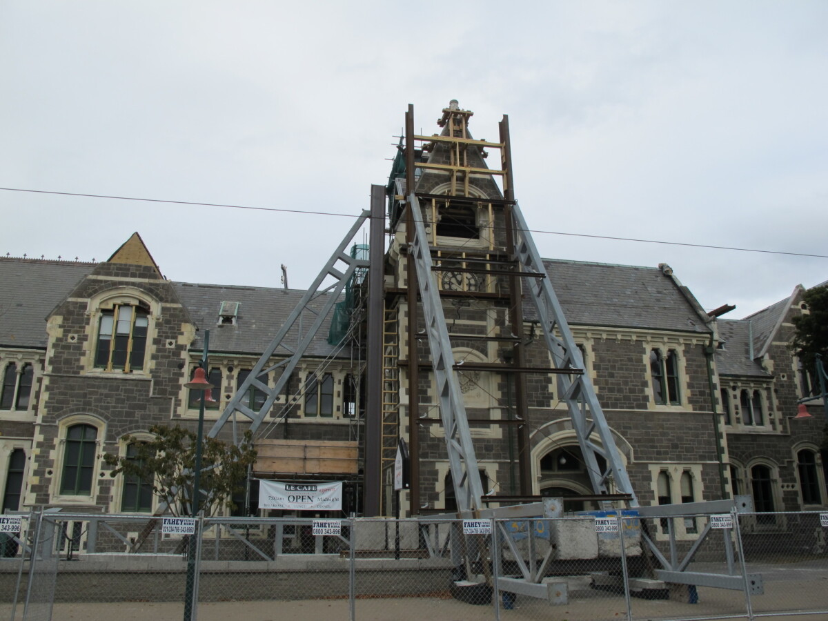 View of the clock tower at the Arts Centre on Worcester Boulevard braced prior to repairs taking place.