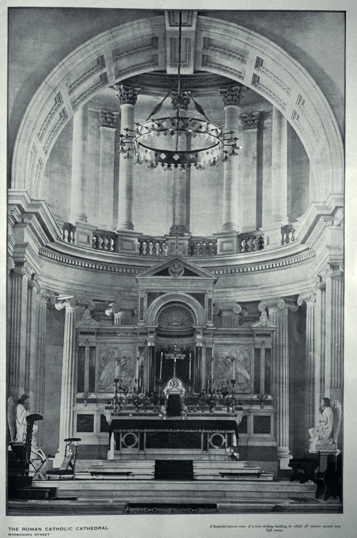 The Cathedral of the Blessed Sacrament, Barbadoes Street was designed by Francis William Petre, it is based on old Roman basilicas, but is neo-classical in style, derived from eighteenth century French examples. Tenders for the building were called towards the end of 1900. The foundation stone was laid on 10 February 1901 and the contractors, J. and W. Jamieson, completed the building in four years. Fifty men were employed on its construction, which required more than 120,000 cubic ft. of stone, 4,000 cubic ft. of concrete and 90 tons of steel. It is 210 ft. by 106 ft. and reaches a height of 135 ft. The Cathedral was blessed and opened on 12 February 1905, at a total cost of £52,213.