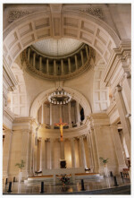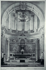 Although Petre had intended the original altar to be in keeping with the style of the building, Bishop Grimes commissioned the elaborate marble and bronze high altar shown in the photograph to be carved by Italian Giuseppe Cassioli. Shipping disruptions caused by the outbreak of World War I meant its final sections did not arrive until 1916. Designed by Francis William Petre, it is based on old Roman basilicas, but is neo-classical in style, derived from eighteenth century French examples. Tenders for the building were called towards the end of 1900. The foundation stone was laid on 10 February 1901 and the contractors, J. and W. Jamieson, completed the building in four years. Fifty men were employed on its construction, which required more than 120,000 cubic ft. of stone, 4,000 cubic ft. of concrete and 90 tons of steel. It is 210 ft. by 106 ft. and reaches a height of 135 ft. The Cathedral was blessed and opened on 12 Feb. 1905, at a total cost of £52,213.