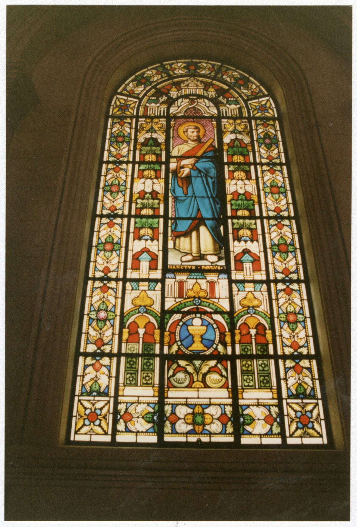 St Paul the Apostle stained glass window from the interior of the Cathedral of the Blessed Sacrament at 122 Barbadoes Street.
