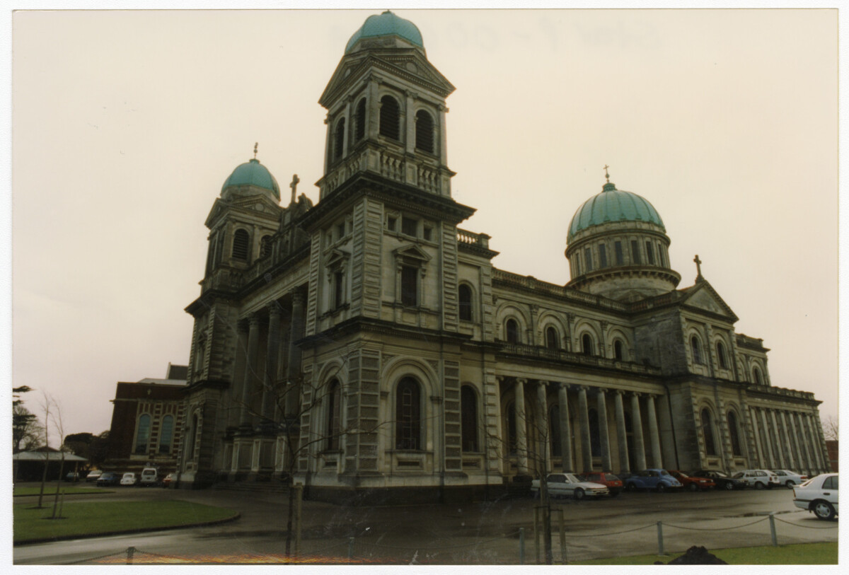 Exterior and car park of the Cathedral of the Blessed Sacrament at 122 Barbadoes Street.