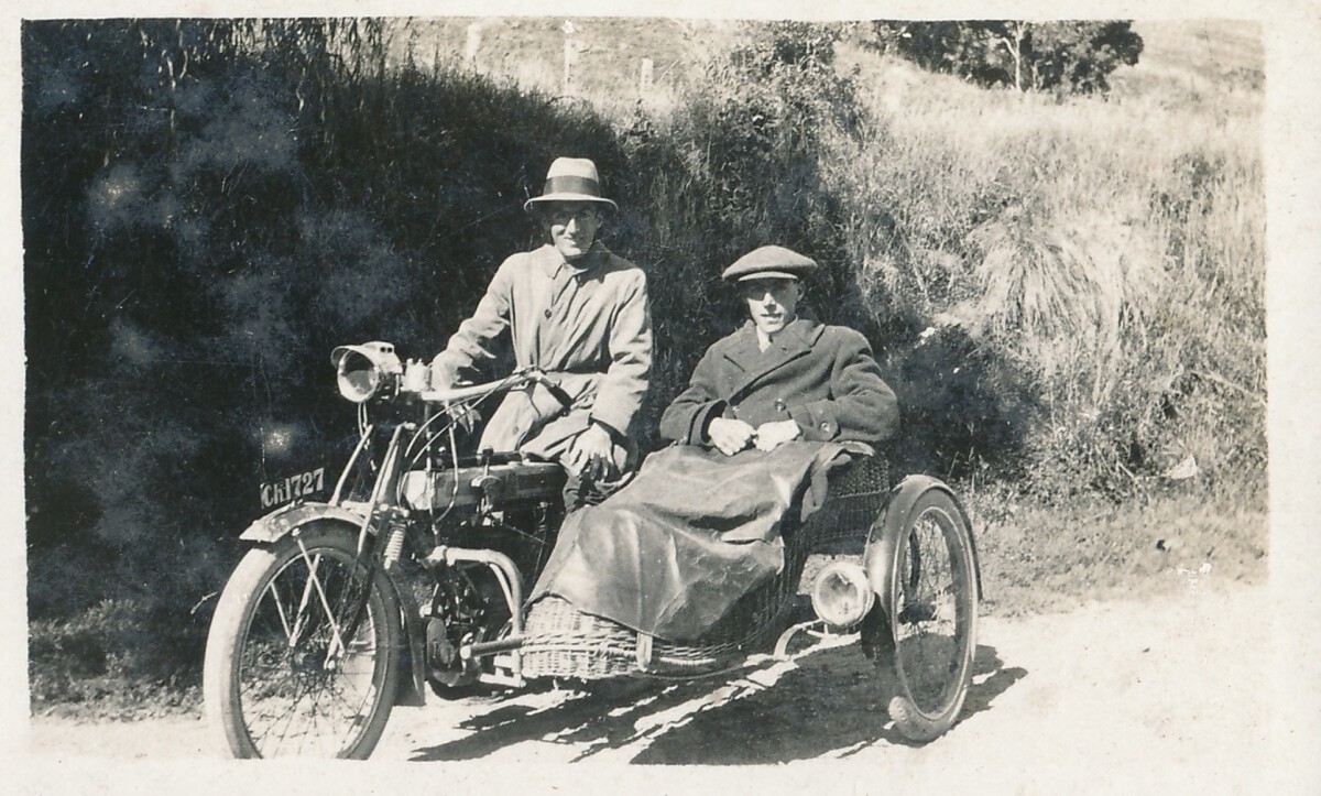 Brothers William (driving) and Arthur Cyril Pearce on a motorbike and sidecar in Banks Peninsula.