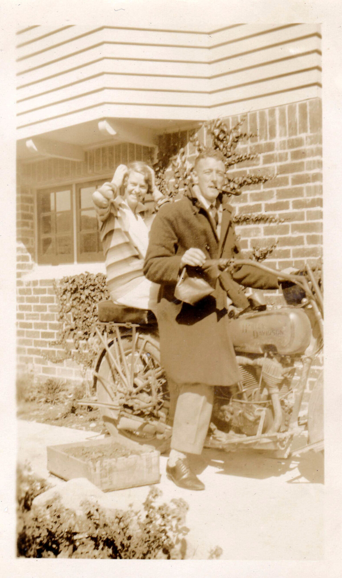 Harold Roland Preston and Margaret Elizabeth Nicholas, known as Greta, on a motorcycle. The photo was taken in Timaru in 1932 and they were married in October 1933.