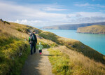 A father and child walk along the Godley Head track on Anzac Day. In the background are the former military buildings. The mouth of Lyttelton Harbour can be seen in the distance.