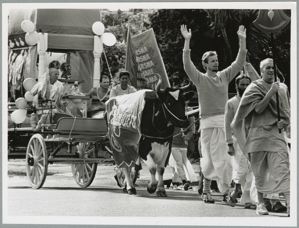 Hare Krishna followers on Bealey Avenue as part of a peace festival parade touring the South Island. A chariot pulled by bullocks is at the back of the parade.