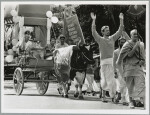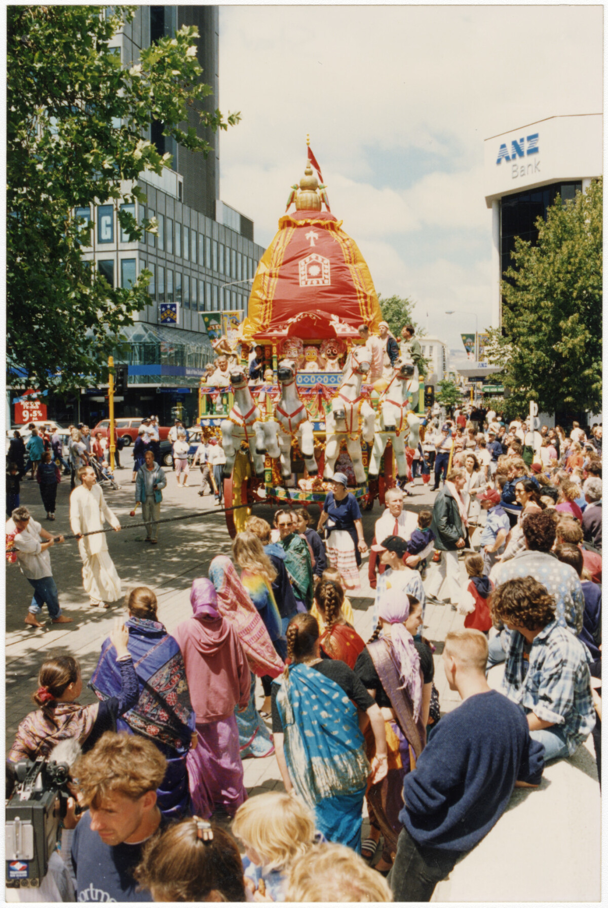 Crowd of people watching a decorative horse and wagon float being pulled through Cathedral Square as part of a Hare Krishna parade.
