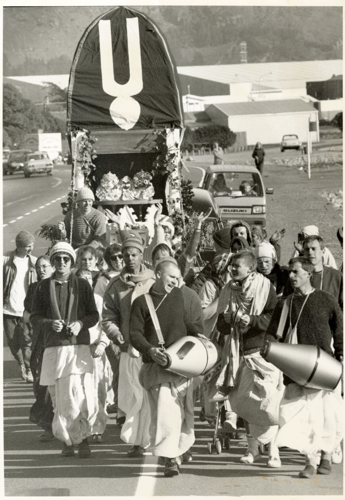 Christchurch members of the Hare Krishna movement parading across the causeway towards Sumner as part of the Festival of the Chariots. Members are shown singing, playing drums and are followed by a chariot.