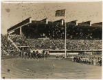 View across the track and pitch towards spectator stands at QEII Park stadium during the opening ceremony of Commonwealth Games. A marching band is travelling along the track with a flock of pigeons taking flight above the pitch.