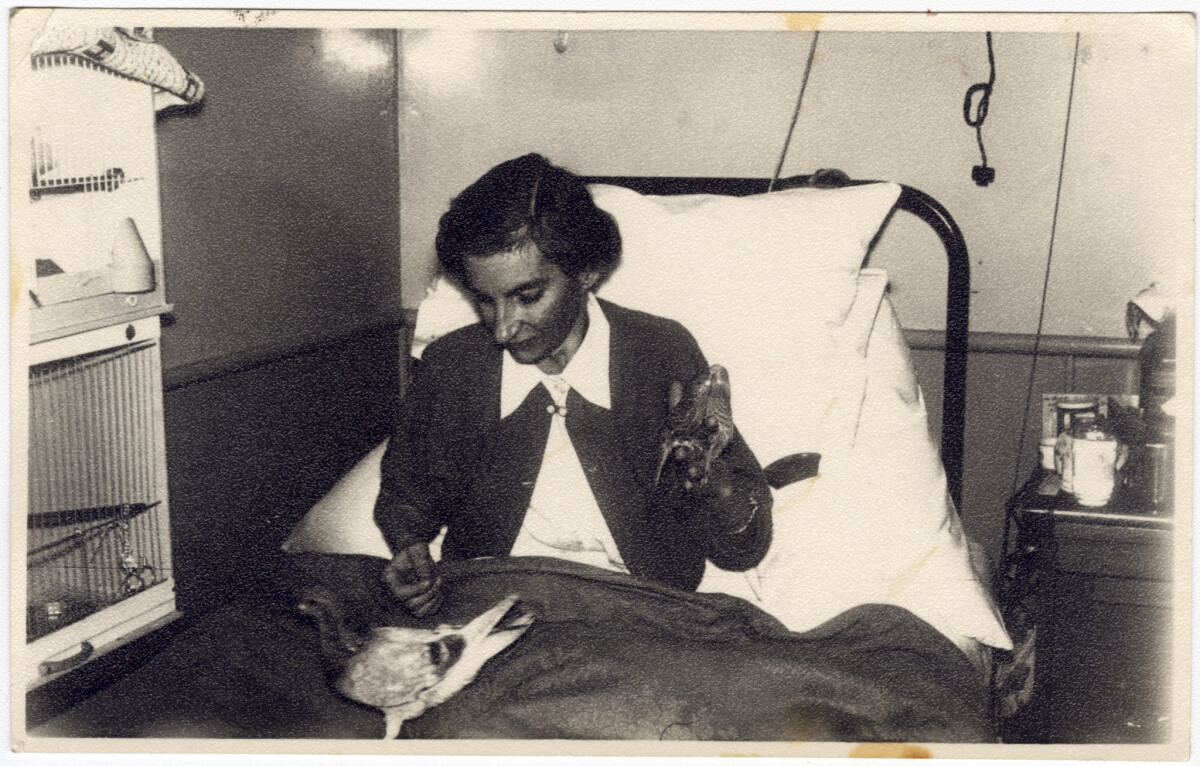 "My Aunty Daphne Marker in her room at the Upper Sanatorium (Cashmere). She was known for her pet birds and her very fine knitting. She used bike spokes and piano wires to knit with and she won all the knitting prizes at the industries fairs. No one could match her. Born 6 November 1925, died 21 July 1958." - Contributor's note