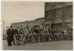 Competitors for the Christchurch Amateur Cycling Club's annual Christchurch-Akaroa return road race lined up at the start, on the corner of Hazeldean Road and Lincoln Road in Addington. The patron of the club, Hon D.G. Sullivan, is stood on the left.