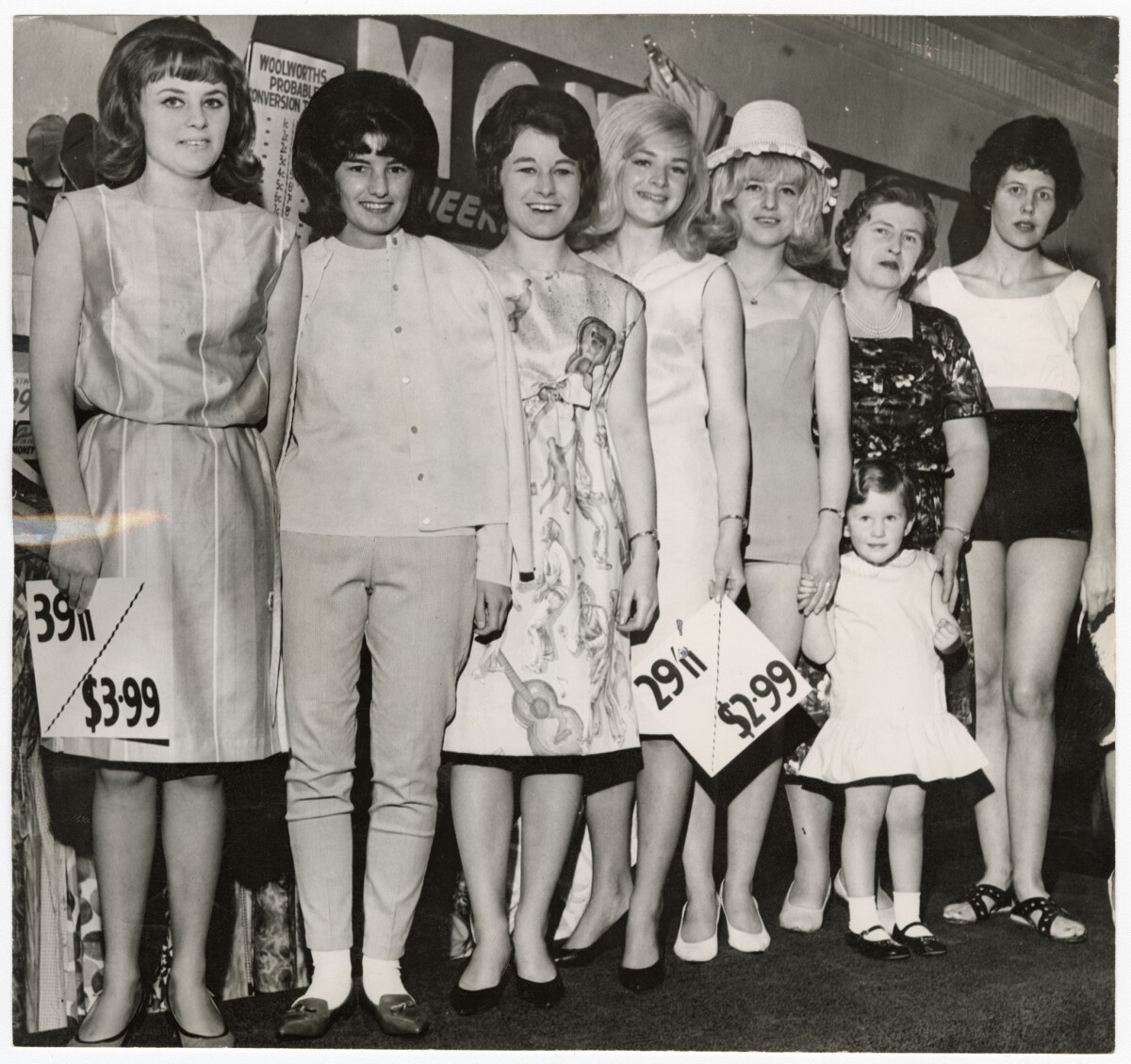 Models at the Woolworths store on High Street wearing the latest fashions on sale and holding price tags featuring both sterling and decimal currency. Models, from left, Faye Laws, Helen Saunders, Margaret Flatman, Pamela Whitta, Lorraine Saunders, Mrs Rhoda Thomas, Mrs Wendy Rowley and Sandra Chinnery (Child).