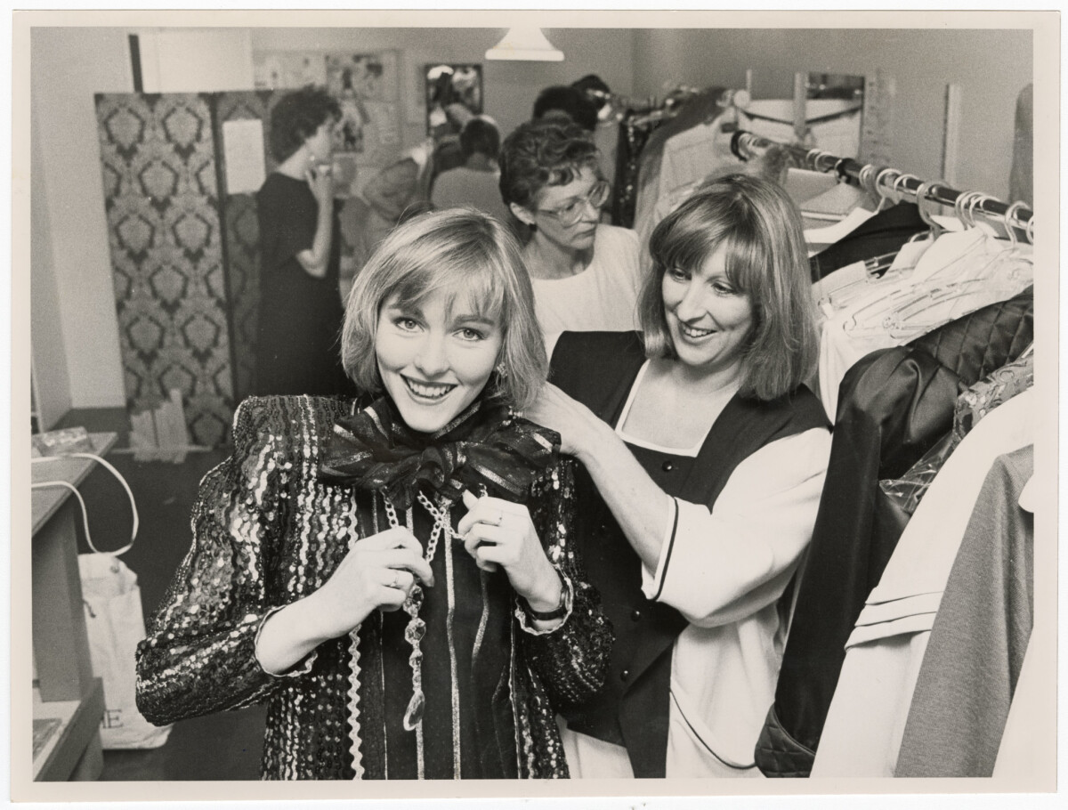 Megan Gainsford, model, in the changing rooms preparing for a Barbara Lee fashion collection show.