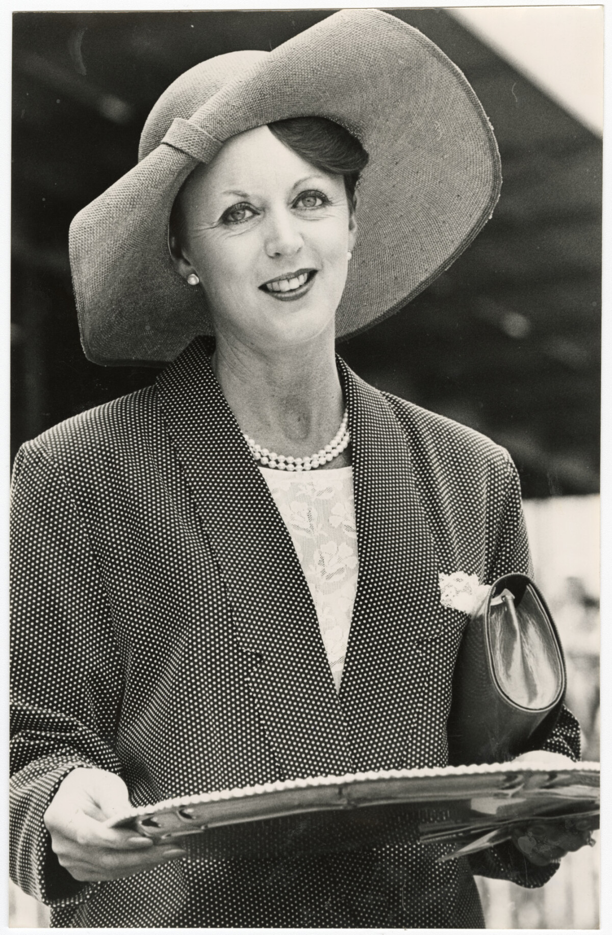 Sandra Wilkinson, winner of the Quinns Fashions Best Dressed Lady at the Races during the NZ Cup meeting 1985 in Addington.