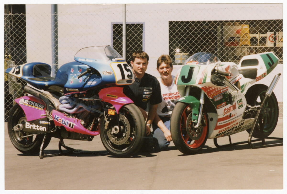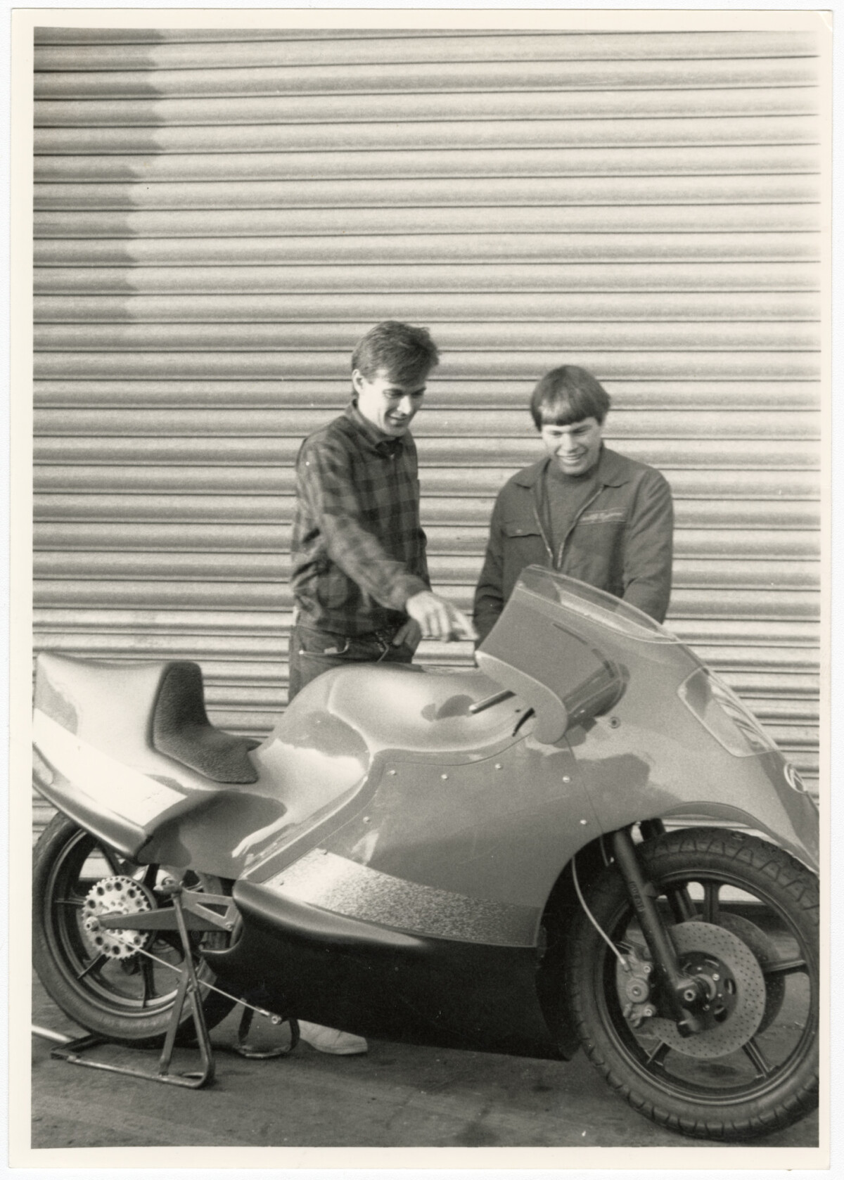 John Britten, on left, designer of world record setting motorcycles, and Mike Brosnan, mechanic, inspecting the Aero-d-Zero motorcycle. It is a Ducati powered pre-curser to the Britten bike, with the engine built by Mike Brosnan and the fairing designed and built by John Britten. This is most likely outside the Loadlift workshop on Annex Road. The fairing had just been finished and is just sitting on the bike yet to be attached, and the chain is also to be fitted.