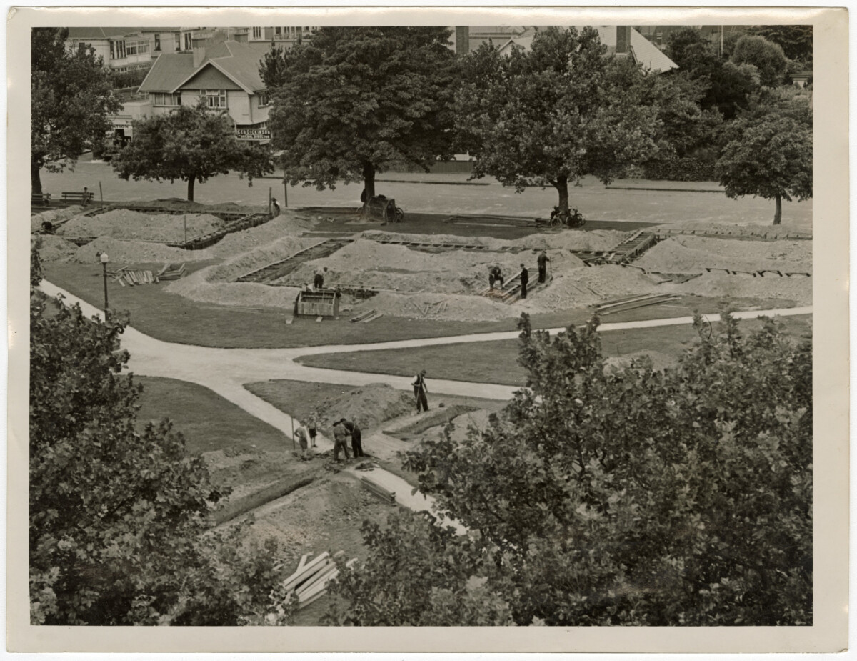View down onto Latimer Square during the digging of shelter trenches during the Second World War. The shelters were intended to provide a safe space during possible air raids on Christchurch in the war years.