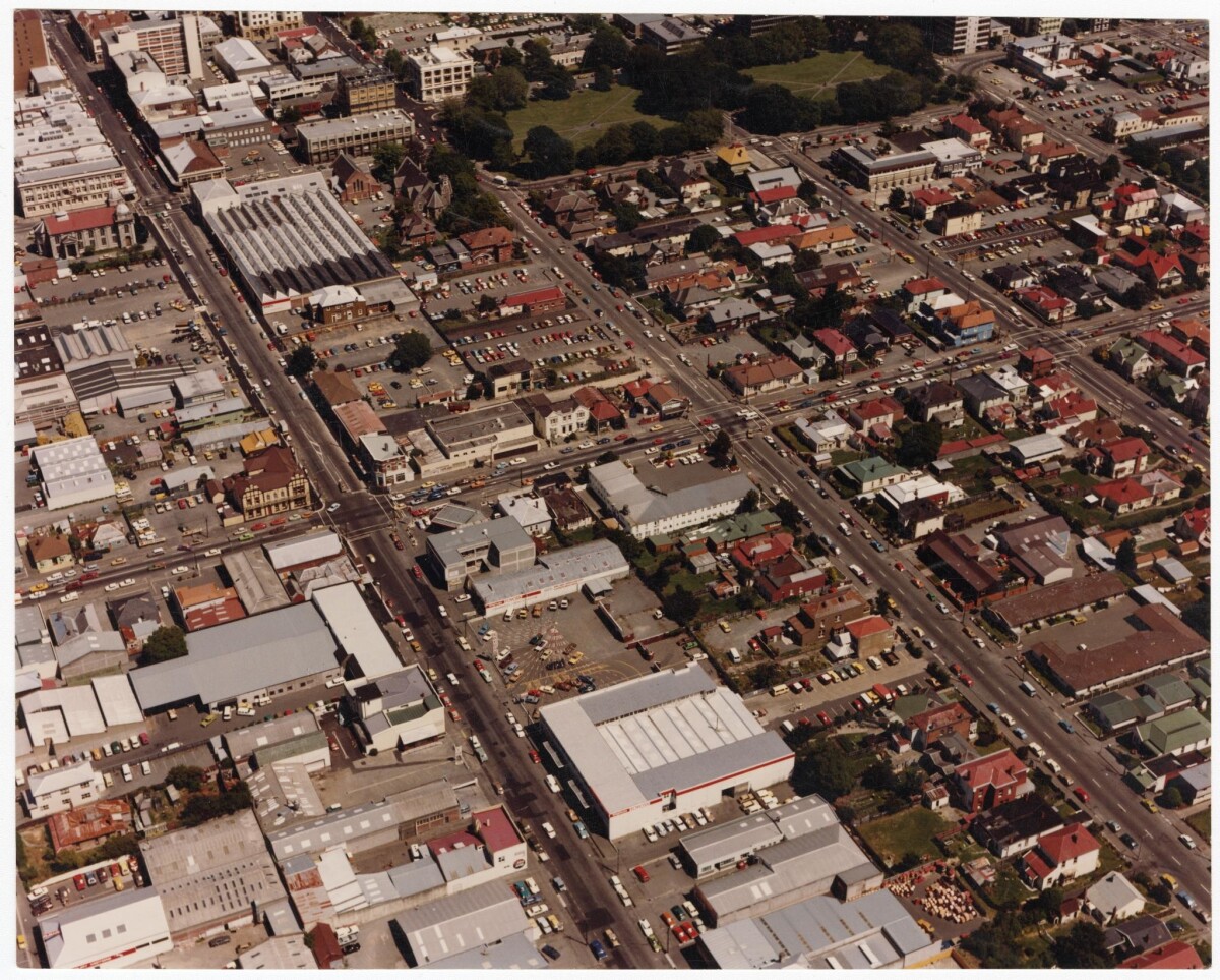 Aerial view of the central city looking towards Latimer Square along Cashel Street, Hereford Street, Worcester Street, Gloucester Street. Barbadoes Street is running along the centre.